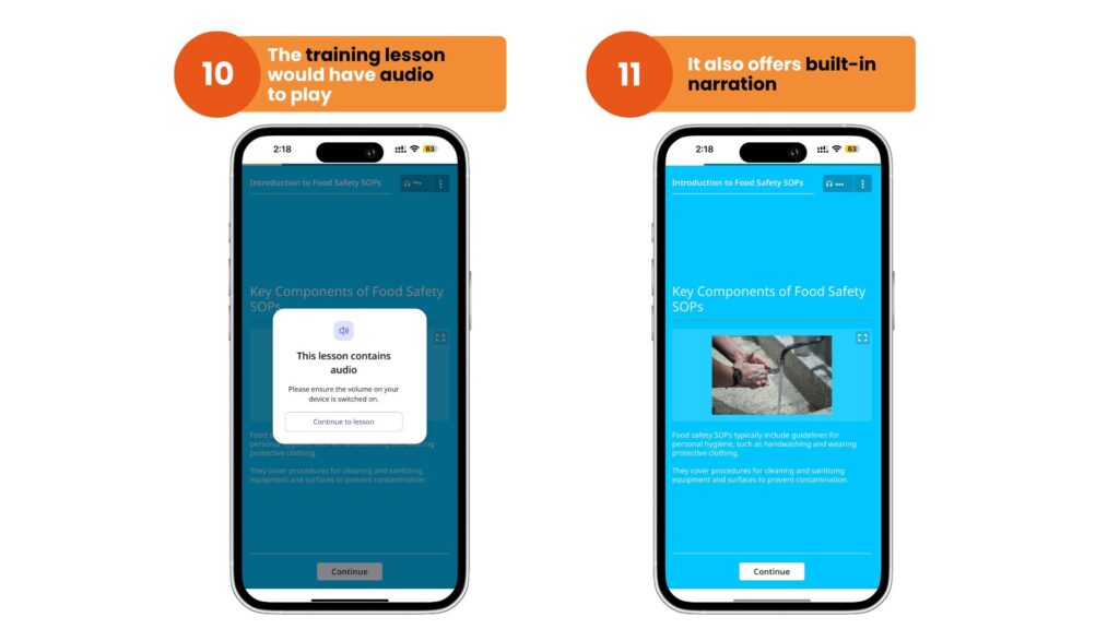 Instant Translation for Training: SafetyCulture Training allows moderators to translate digital food safety courses from English into any preferred language immediately, making it easier for all staff to follow.